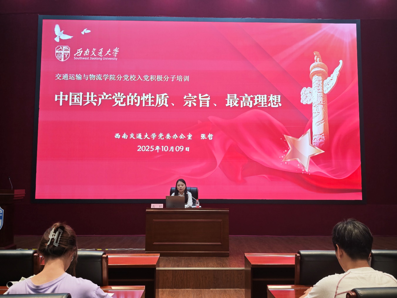 为加强入党积极分子培养教育,提高党员发展质量,交通运输与物流学院分党校2025-02期入党积极分子党课培训于10月9日至14日在犀浦校区交运楼418报告厅开展了集中课堂教学,92名入党积极分子参加了培训。