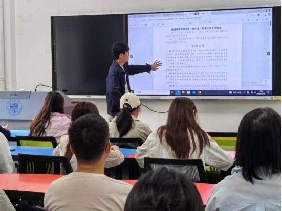 刘鑫洋首先围绕《关于推动高校学生会(研究生会)深化改革的若干意见》展开讲解。他强调,研究生会是党领导下的主要学生组织,必须坚持以习近平新时代中国特色社会主义思想为指导,明确职能定位,发挥桥梁纽带作用,全心全意为同学服务。此外,他还详细阐述了改革运行机制,包括实行轮值制度、精简组织架构、严格遴选条件与程序等内容,并指出研究生会要广泛动员同学力量,善于结合班级工作和社团活动开展符合学校特点的服务项目。